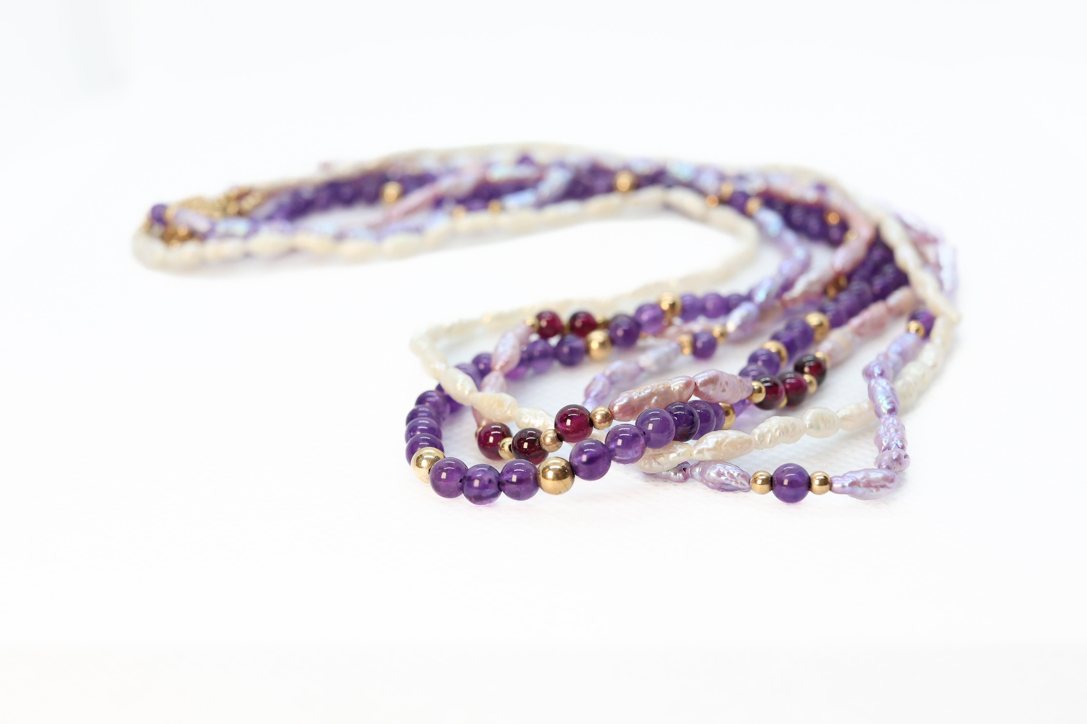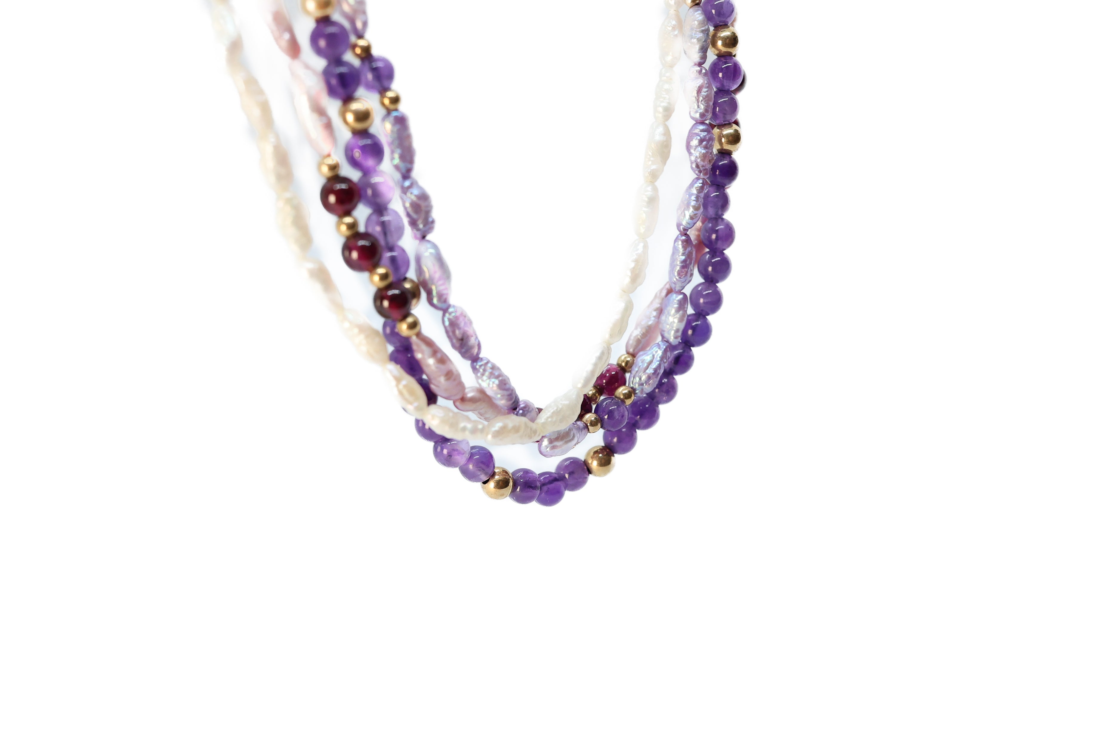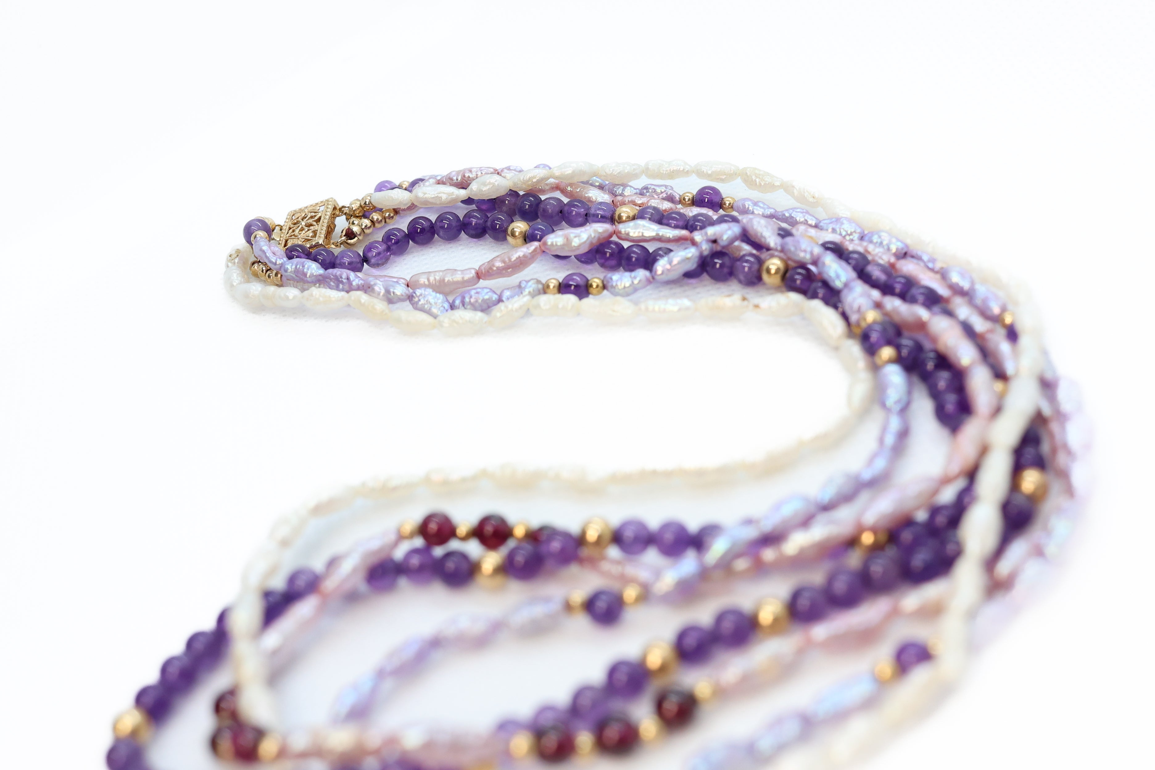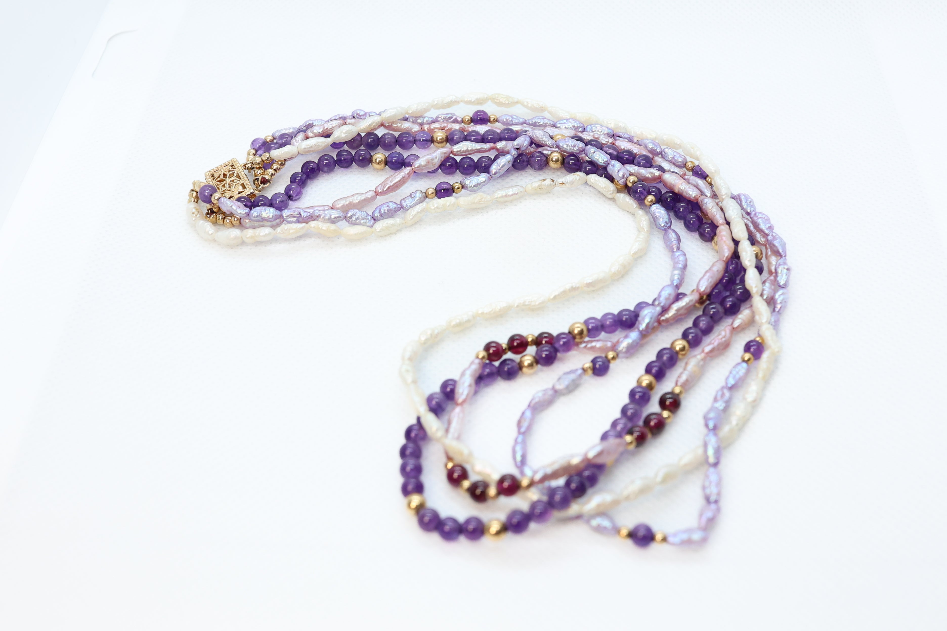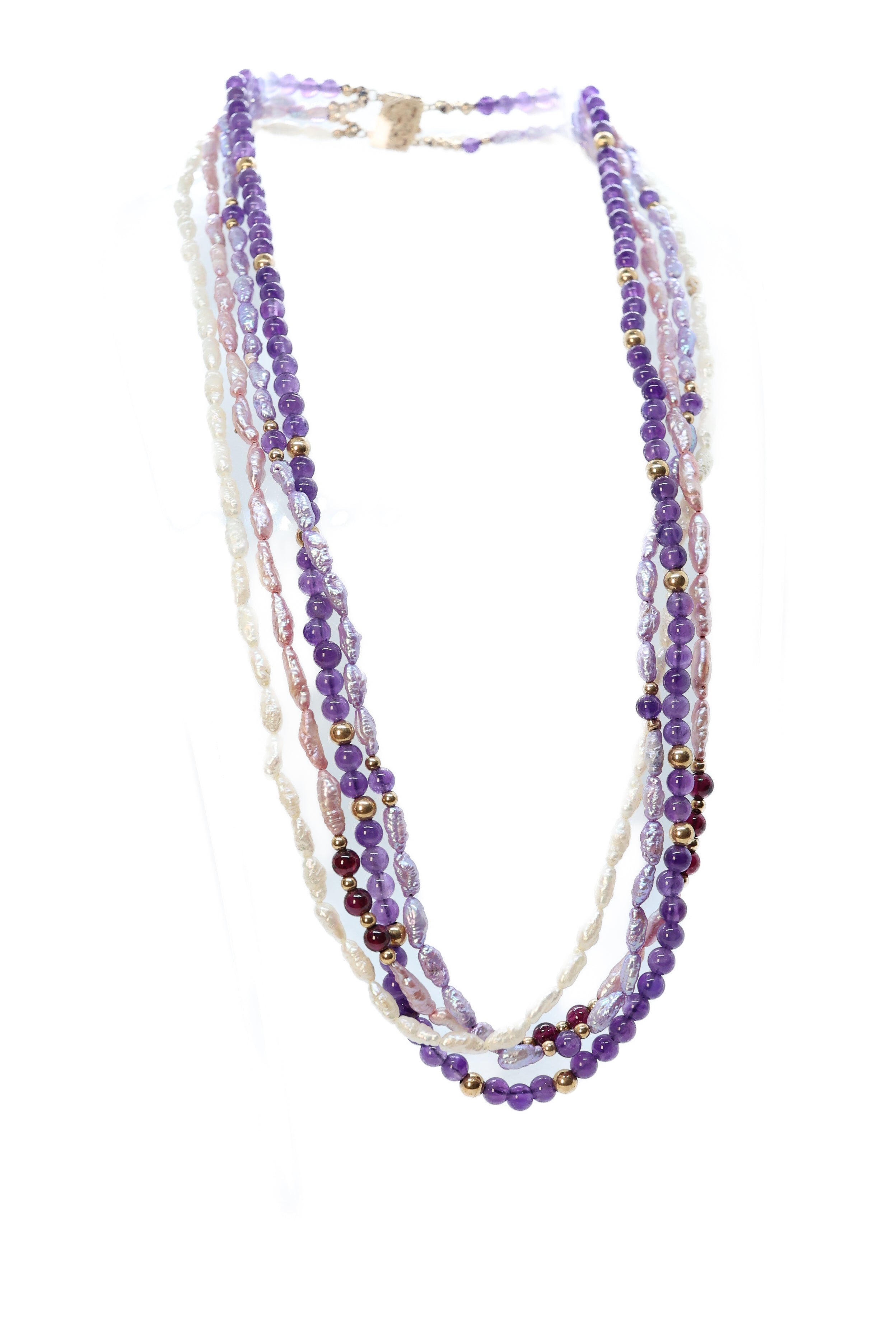 This layered necklace is beautifully strung with four different strands and beads. All the strands are unique. One is adorned with 4mm amethyst purple beads. The three other strands are multi color fresh water Pearls, completed with a 14K yellow gold box clasp.