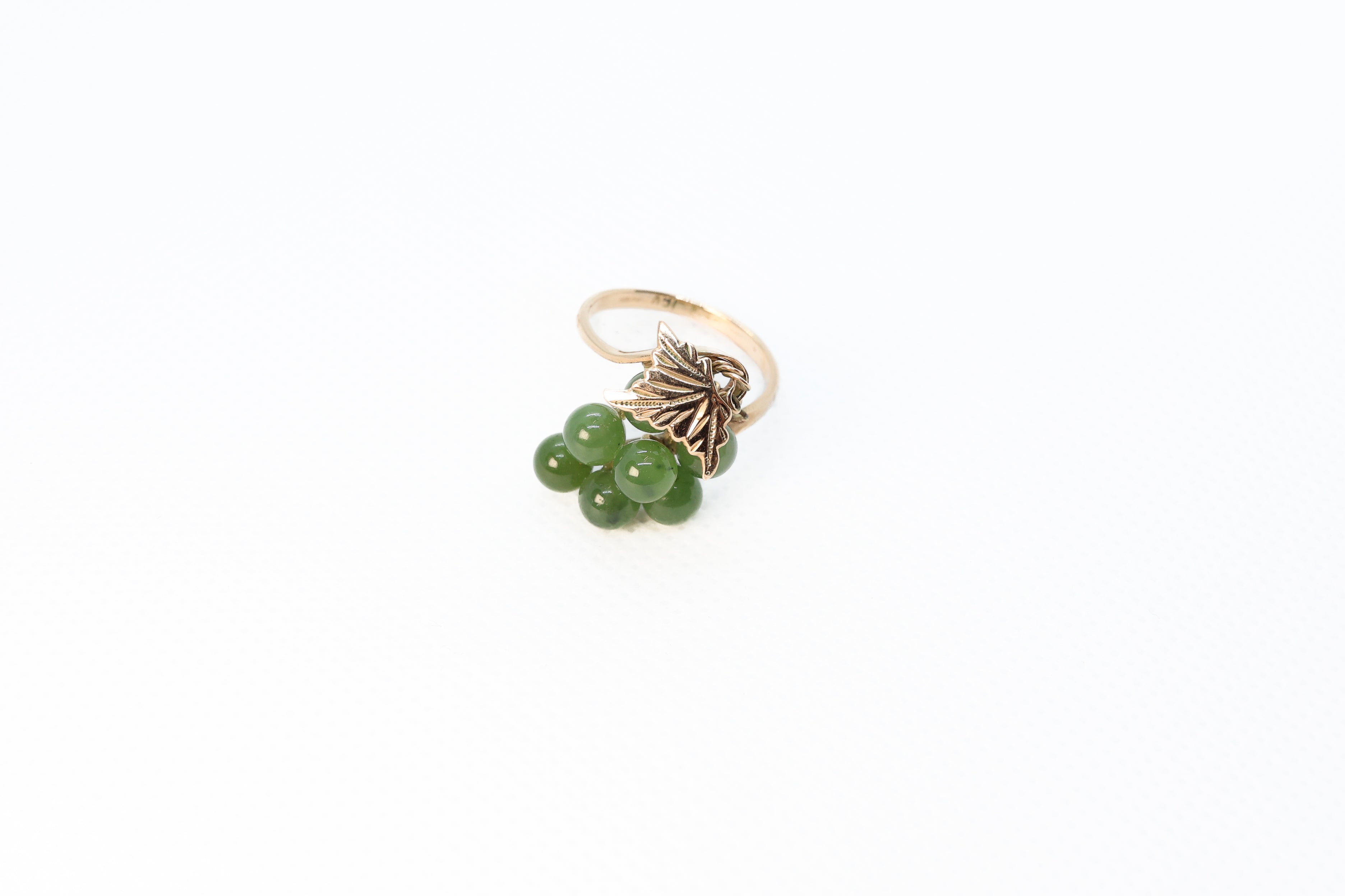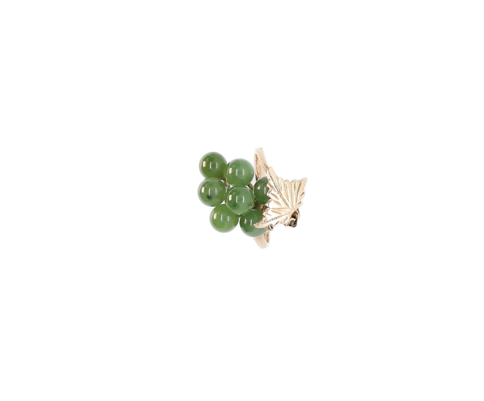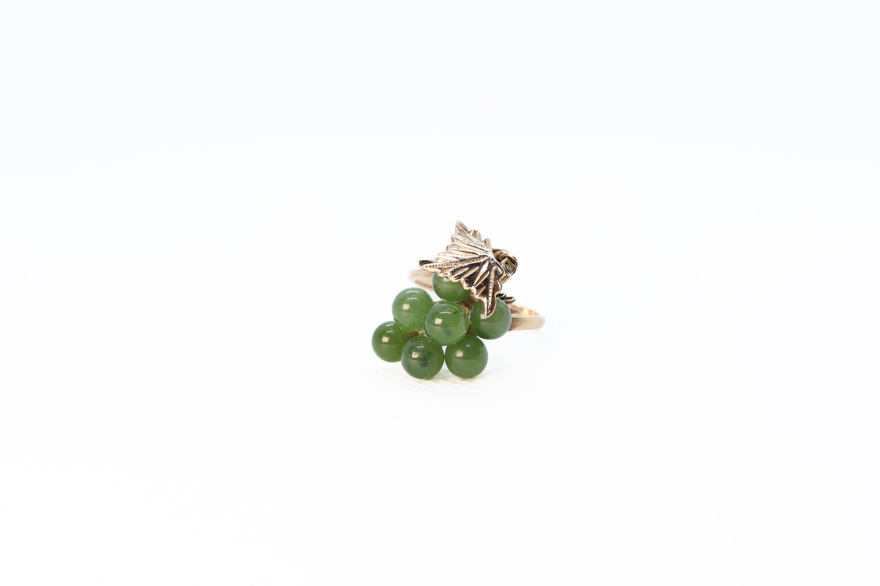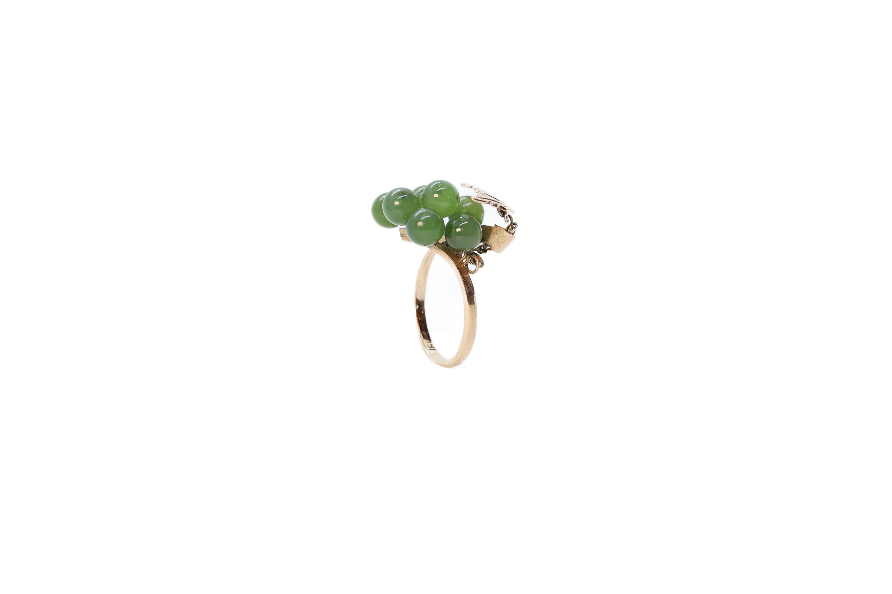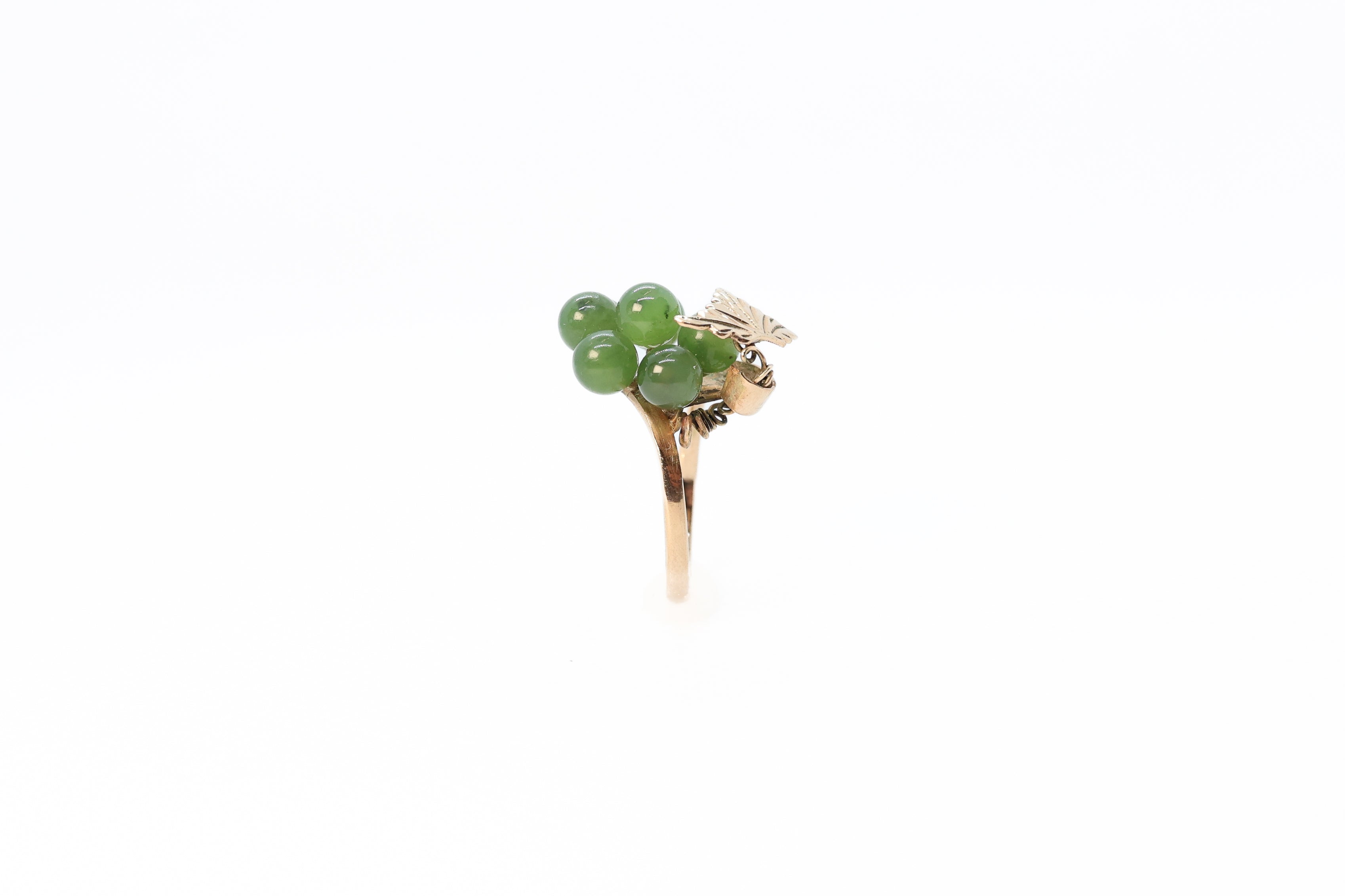 This vintage piece of jewelry offers a fun twist on a jade ring. Adorned with seven, round, jade beads, this ring arranges them in the shape of a bunch of grapes. This grapevine motif gives the ring a playful and youthful feel, perfect for anyone to enjoy.