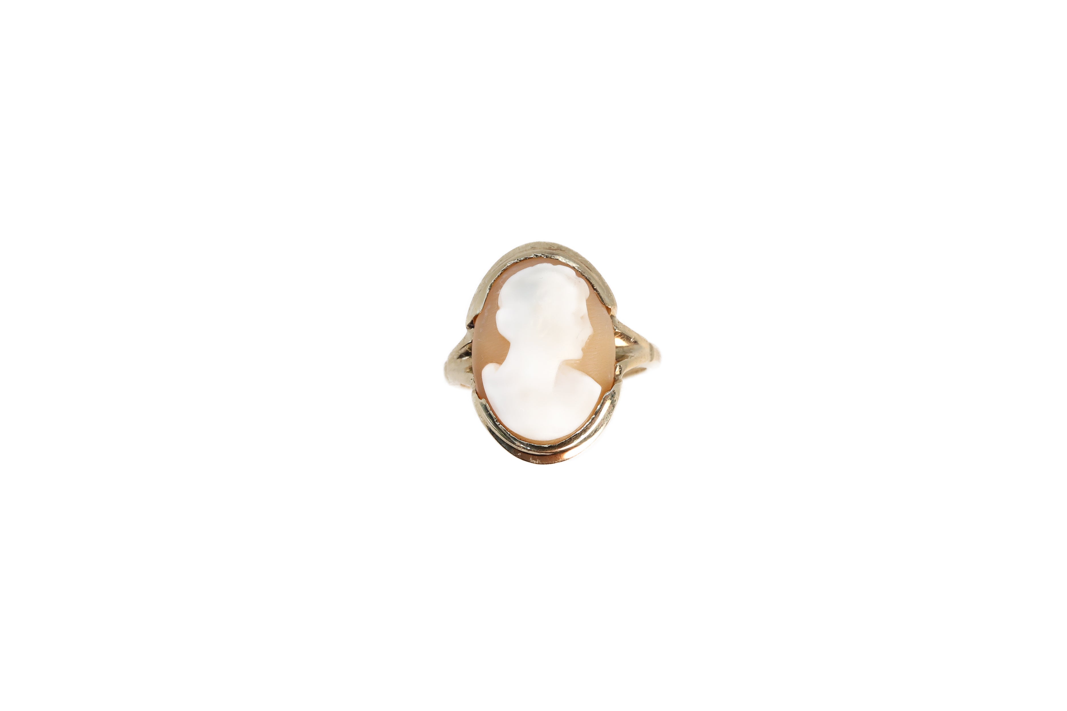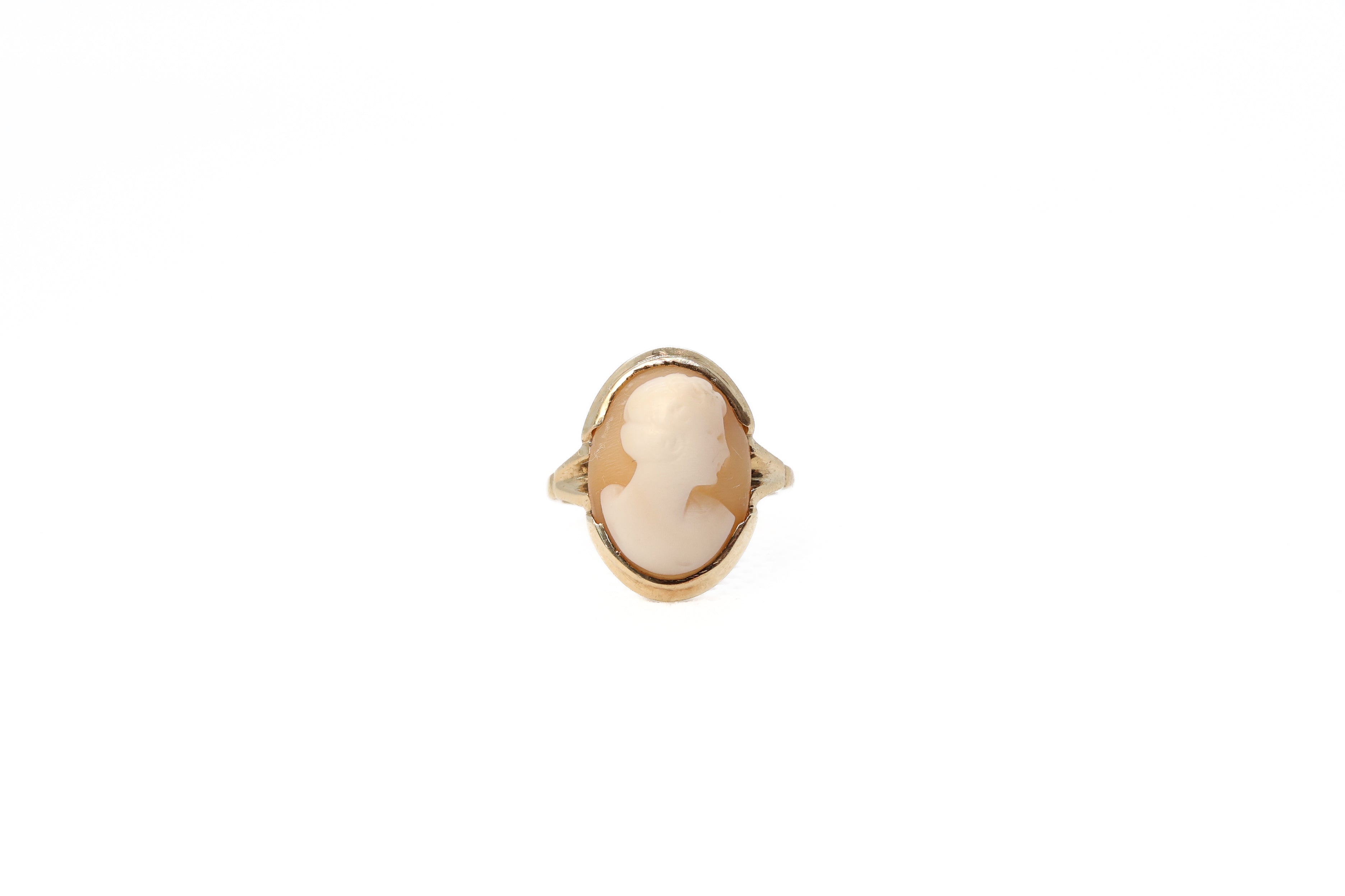 In a vintage design, this ring features a cameo of a portrait of a lady.  This portrait is done with shell. This is mounted in 10k pink gold, while the band of the ring is made with 10k yellow gold. This ring is a truly timeless design, ready to be worn for decades to come.