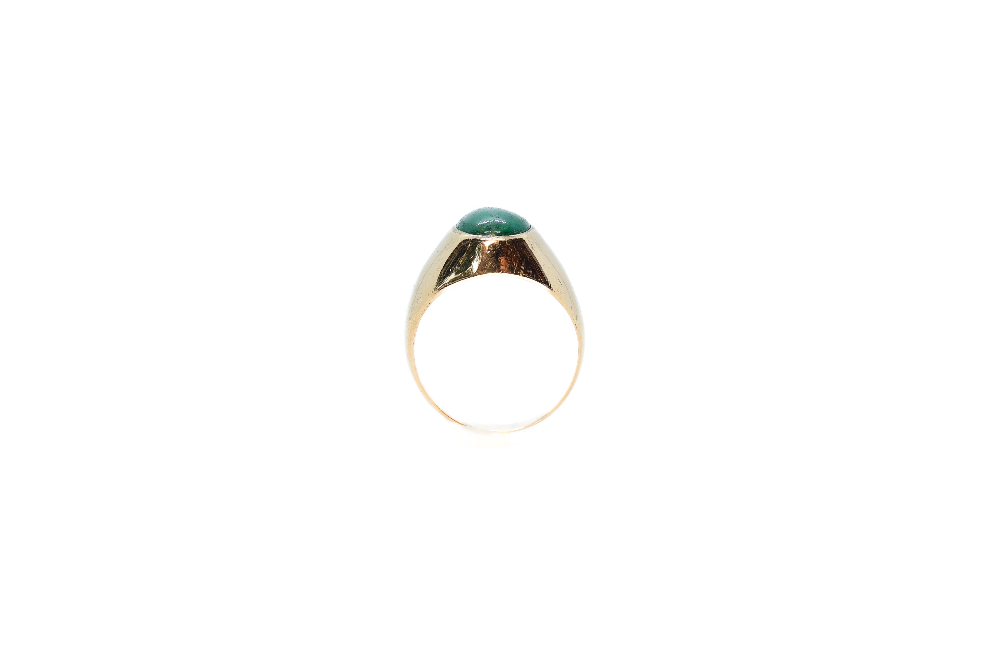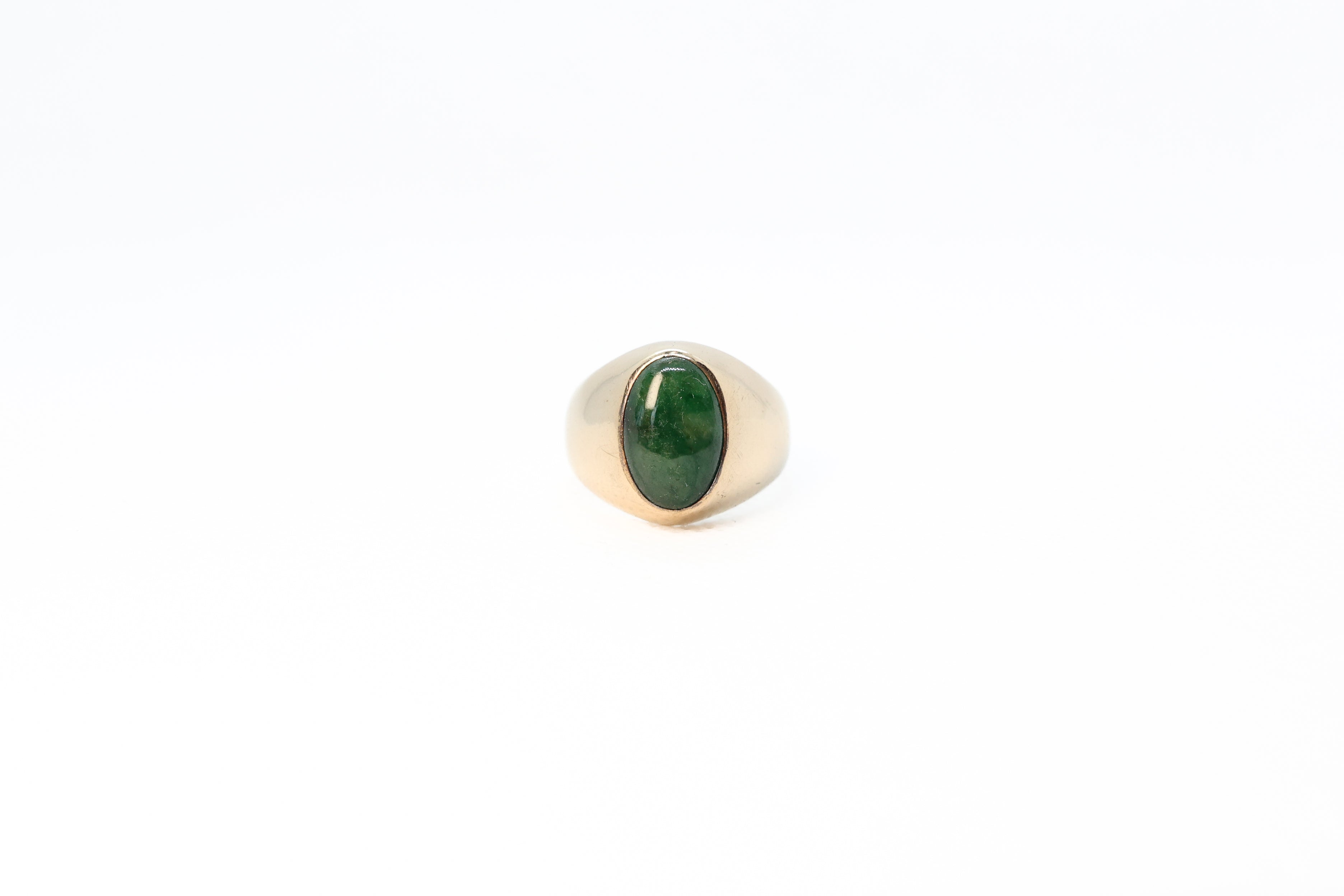 This ring features a high polished, 14k yellow gold mounting adorned by an oval shaped, green jade gemstone. This masculine, vintage ring is a perfect accessory for anyone.